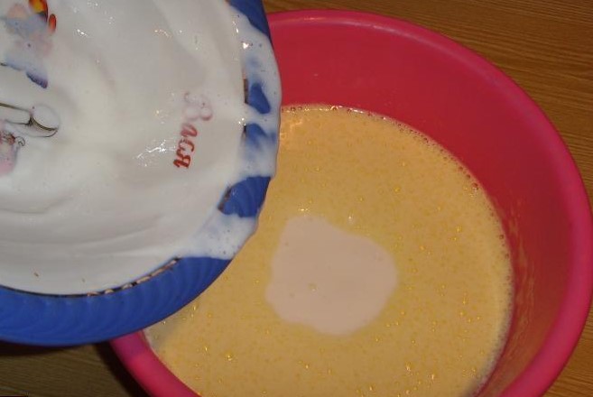 - Eieren, geklopt met suiker, mengen met zure room en kwarkroom, de eieren voorzichtig verdelen en roeren in de wrongel.