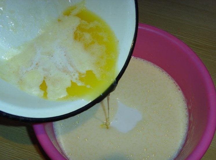 Giet daarna de boter in de kom met het toekomstige deeg en meng alles voorzichtig tot de vloeistof volledig homogeen is.