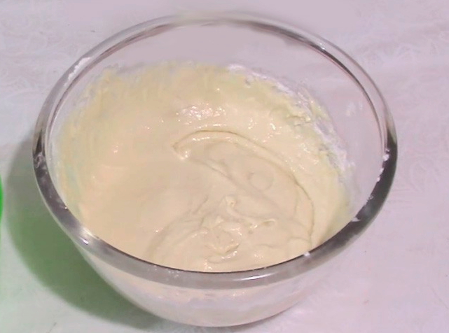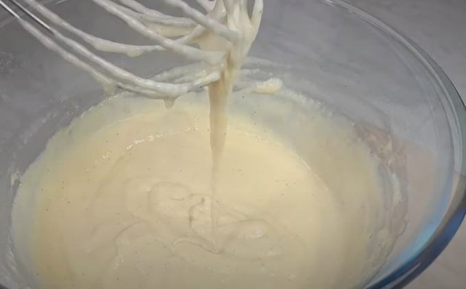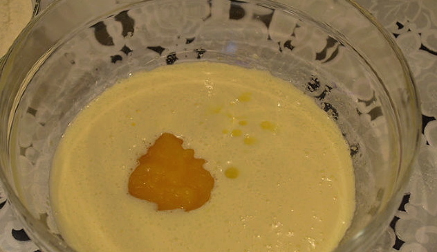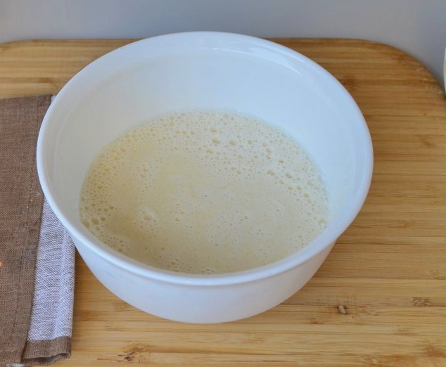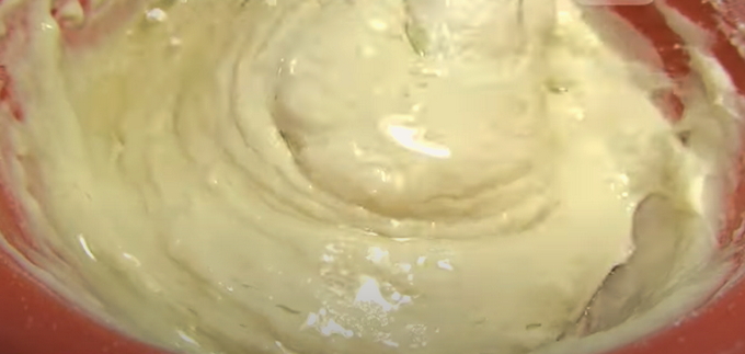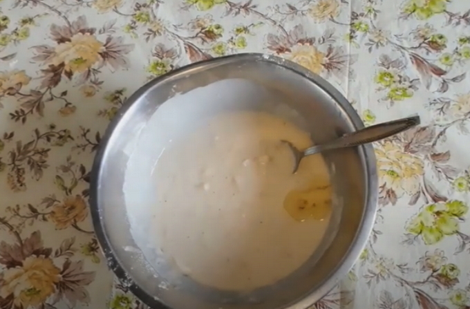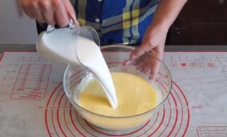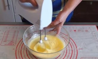 - Breek eieren, meng ze met vanillesuiker. We combineren de eimassa met kefir. Roeren.