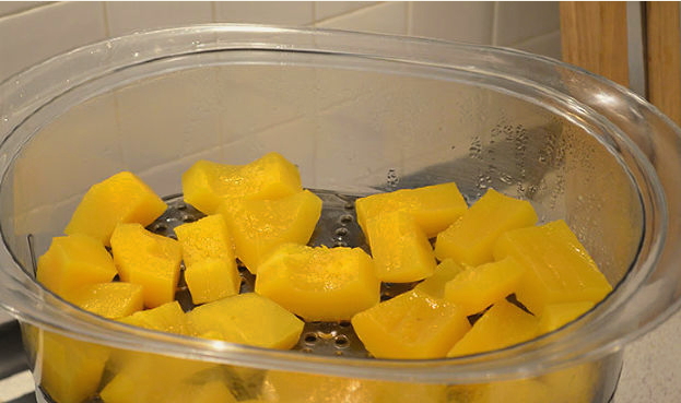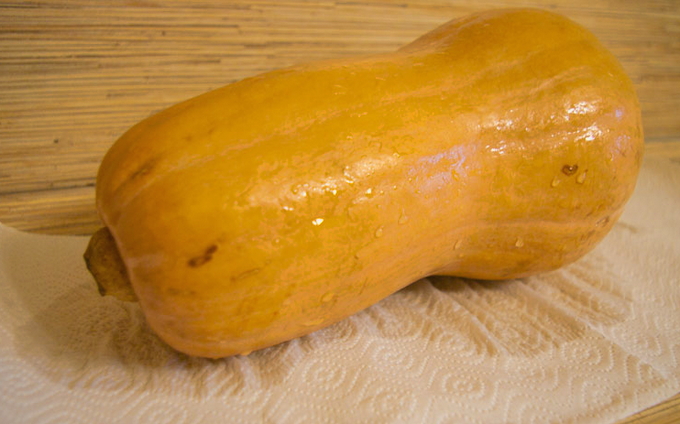 - Snijd de pompoen in twee helften. Doe ze in een pan met water en laat 20-30 minuten koken. Van de gekookte pompoen moet je het vruchtvlees met een lepel uit de kern halen en de zaden verwijderen als ze tegen komen.