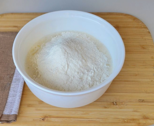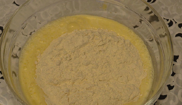 - Giet geleidelijk de bloem erin, roer het mengsel en probeer alle klontjes te roeren.