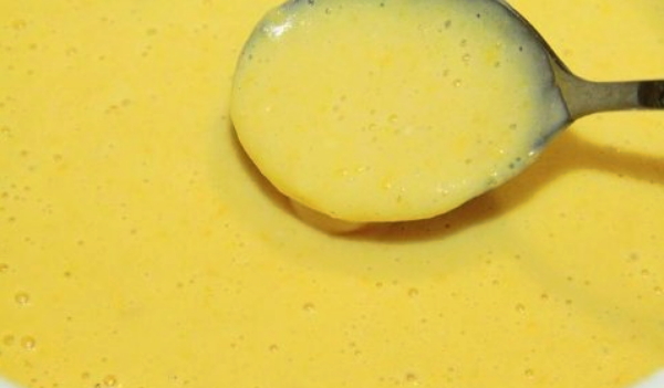 We controleren de juistheid van onze test met een lepel. Het ideale pannenkoekdeeg moet qua dikte vergelijkbaar zijn met gecondenseerde melk.