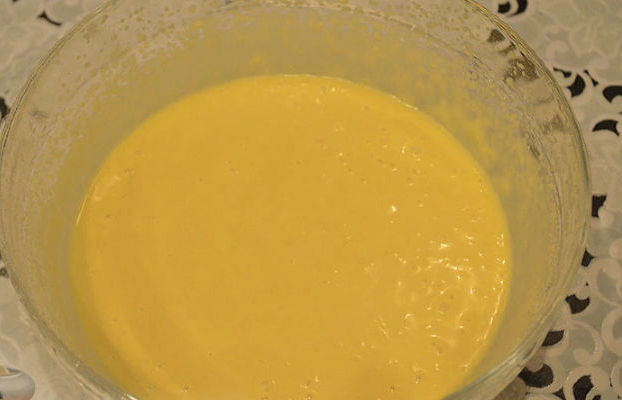 - Klop de massa met een mixer. Als het glad is, kun je bakpoeder en kruiden (gember, nootmuskaat, vanillesuiker) toevoegen en vergeet niet een lepel plantaardige olie toe te voegen om te voorkomen dat de pannenkoeken blijven plakken. Klop ons deeg opnieuw.