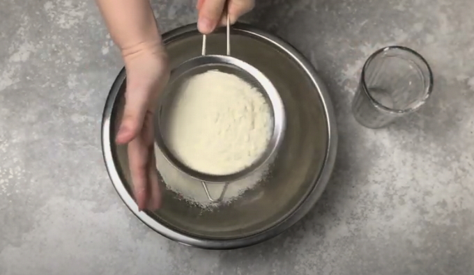 - Nu zeven we de bloem, dit moet gebeuren, anders worden de pannenkoeken niet zo luchtig. Meng het met bakpoeder en bakpoeder. Voeg suiker en zout toe aan het mengsel.