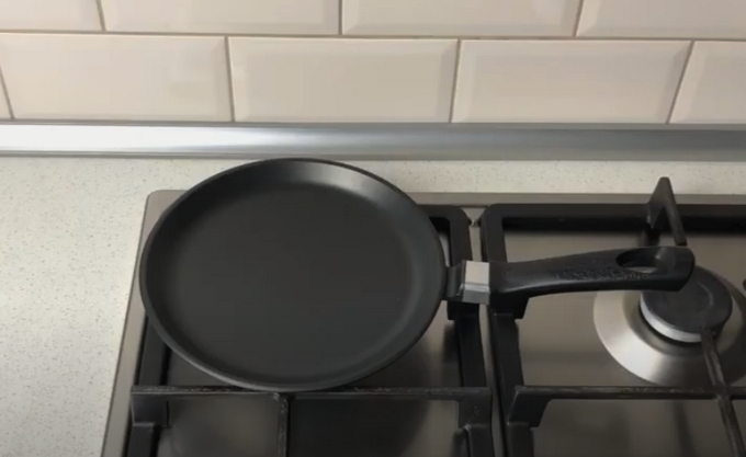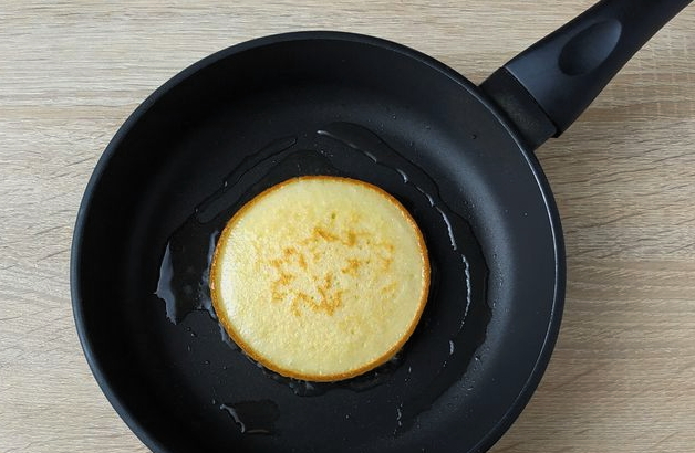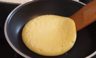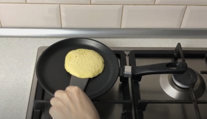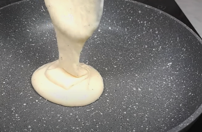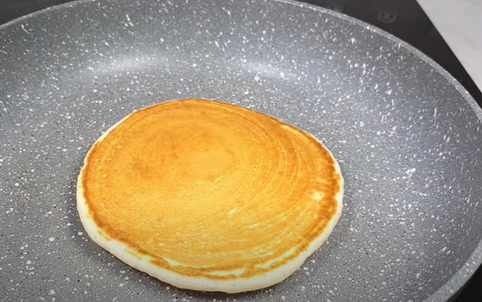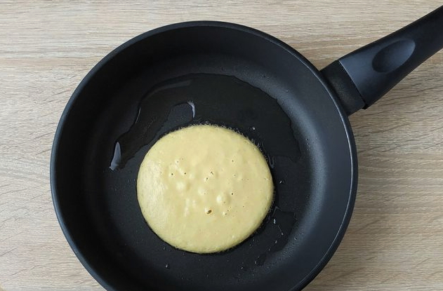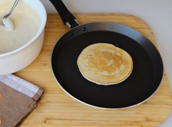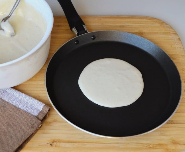 - We verwarmen de pan met een antiaanbaklaag. Giet de eerste portie uit (een halve pollepel is genoeg voor één pannenkoek) bak de pannenkoek aan beide kanten. Het moet rijzen en goed bruin worden.
