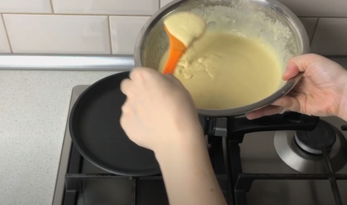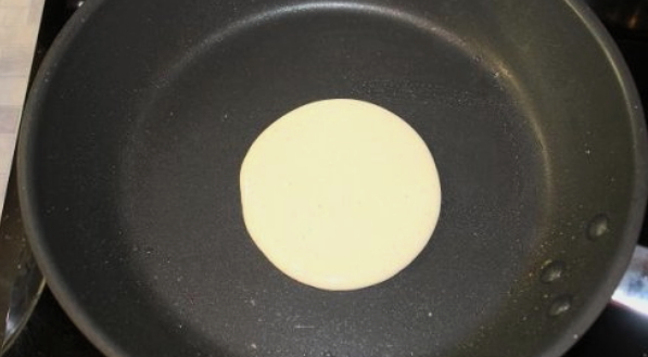 - De pan is verwarmd, het is beter om te nemen met een antiaanbaklaag. Voor pannenkoeken heb je een droge koekenpan nodig. Voor een goede pannenkoek hebben we 1/3 kopje deeg nodig voor elke pannenkoek.