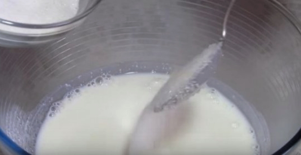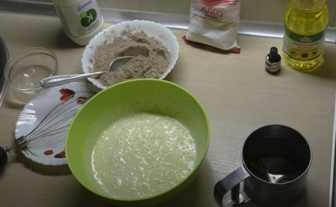 - Giet kefir in een andere kom, meng het met suiker en een ei. Voeg frisdrank toe aan de massa, roer alles goed door.