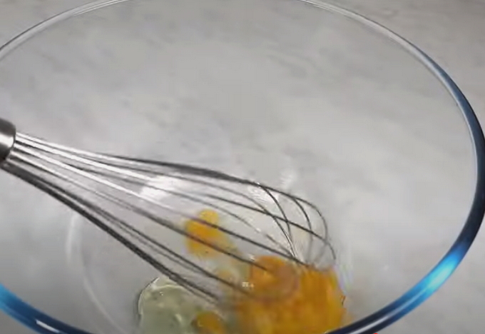 Pannenkoekdeeg lijkt een beetje op koekjesdeeg. Daarom nemen we de container dieper, omdat: we moeten 2 eieren kloppen met een mixer, samen met gewone kristalsuiker en een snufje zout.