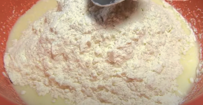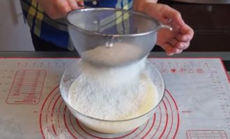 Om de pannenkoeken luchtig te maken, moet je de stilstaande bloem een beetje losmaken. Daarom zeven we het door een zeef en voegen het toe aan de eimassa. Kneed het deeg.