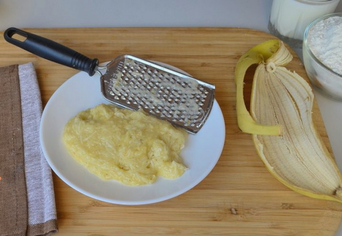- Verwijder de schil van de bananen, snijd ze in verschillende helften en maal ze fijn met een vork.
