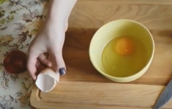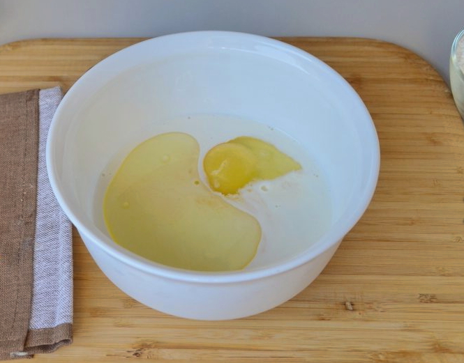 - Giet kefir in een andere container, voeg een ei toe en roer het mengsel.