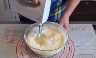 - Voeg geleidelijk bloem toe, neem een mixer en klop het deeg grondig, verwijder alle klontjes.