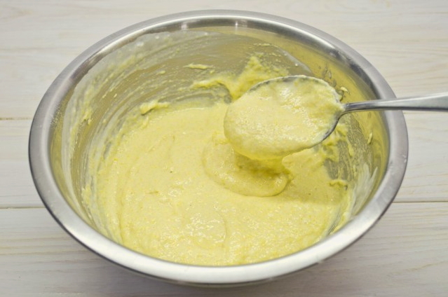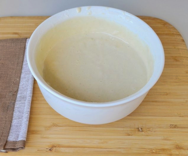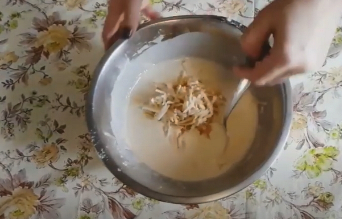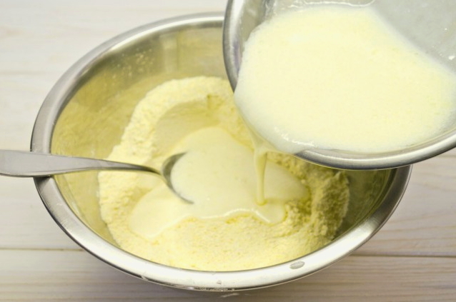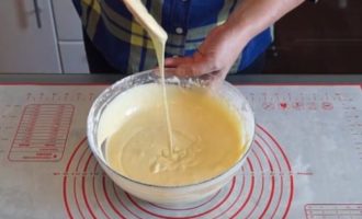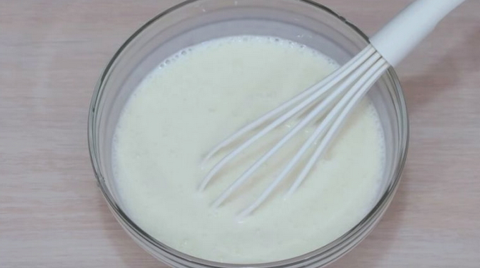 - We mengen het vloeibare mengsel met de vrijstromende massa. Meng heel grondig zodat de pannenkoeken luchtig worden, het is beter om niet lui te zijn en ze met een mixer te kloppen.