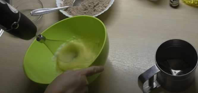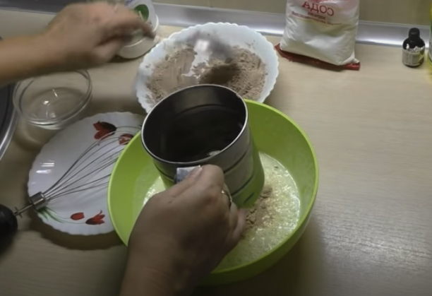- Voeg geleidelijk bloem toe in kleine porties en voeg dan cacaopoeder en bakpoeder toe. Giet 1 eetl. plantaardige olie in het deeg.