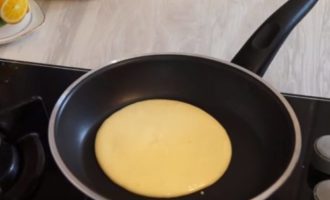 - Bestrijk de pan met plantaardige olie. We verwarmen het en gieten het deeg met een schep, verdelen het zodat de pannenkoek ongeveer de helft van de pan in beslag neemt. Bak de pannenkoek tot er een mooie blos verschijnt. Draai dan om en bak de andere kant.