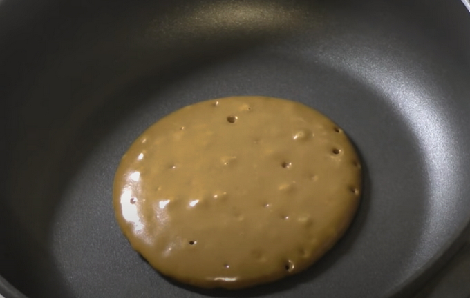 - Laten we beginnen met bakken. We nemen het deeg met een pollepel en gieten de helft in een voorverwarmde pan. Bak de pannenkoek aan beide kanten goudbruin. Er verschijnen bellengaatjes in de pannenkoek.