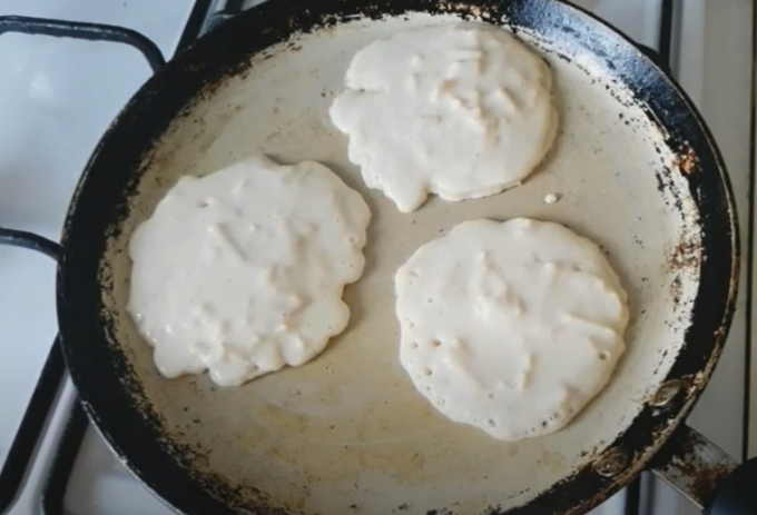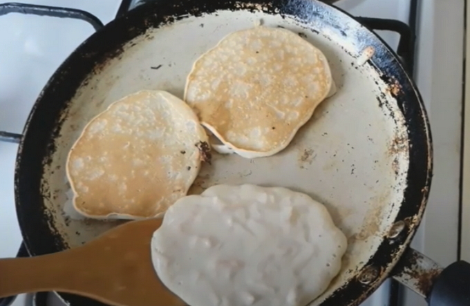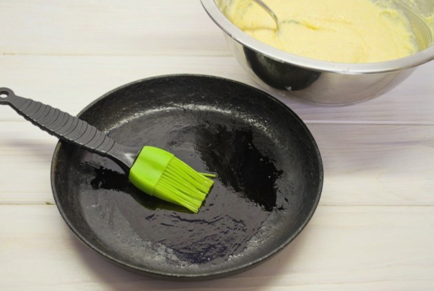 - Bereid de braadpan voor door hem te bedekken met plantaardige olie en te verwarmen. Nu verzamelen we een halve pollepel deeg en gieten het in de pan, laat het iets uitspreiden. We bakken aan elke kant, wachten tot de pannenkoek opkomt en bruin wordt.