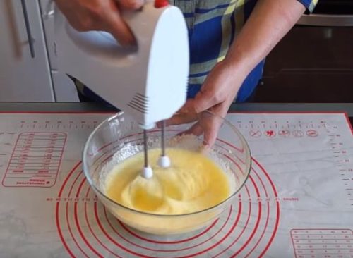 - Breek eieren, meng ze met vanillesuiker. We combineren de eimassa met kefir. Roeren.