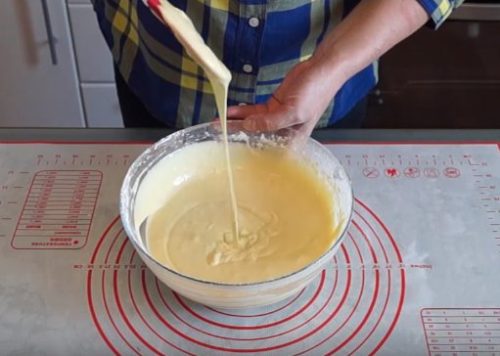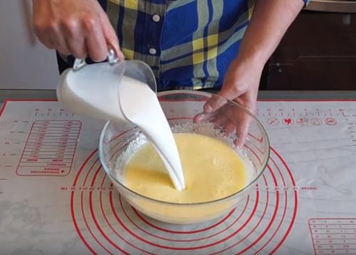 - We mengen het vloeibare mengsel met de vrijstromende massa. Meng heel grondig zodat de pannenkoeken luchtig worden, het is beter om niet lui te zijn en ze met een mixer te kloppen.