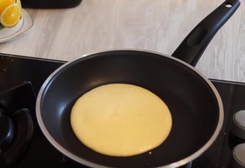 - De pan is verwarmd, het is beter om te nemen met een antiaanbaklaag. Voor pannenkoeken heb je een droge koekenpan nodig. Voor een goede pannenkoek hebben we 1/3 kopje deeg nodig voor elke pannenkoek.