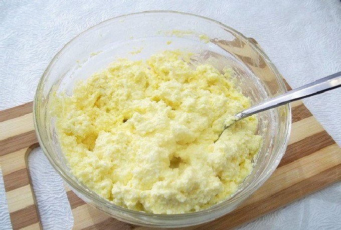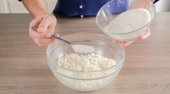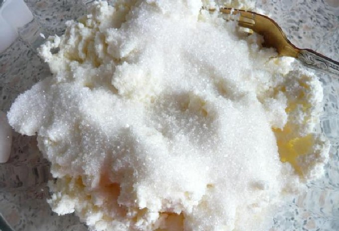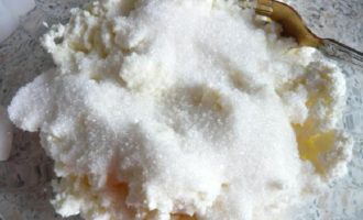 - Breng de geraspte kwark over in een diepe kom, voeg kristalsuiker toe, meng.