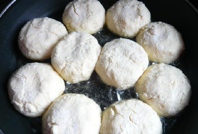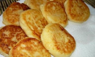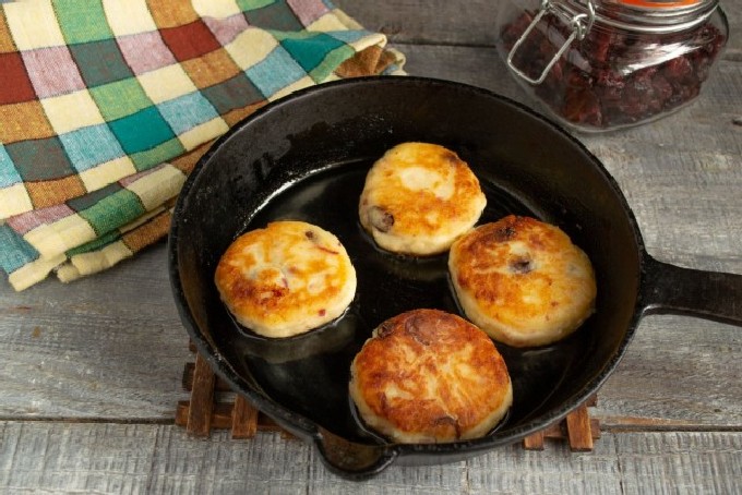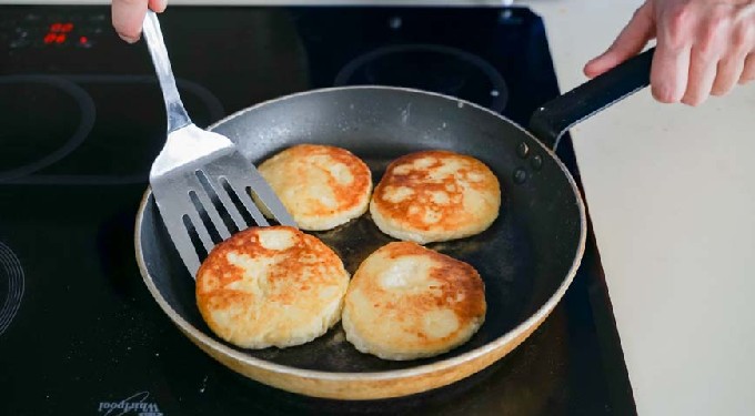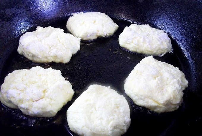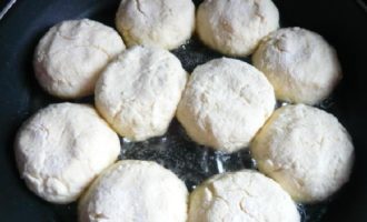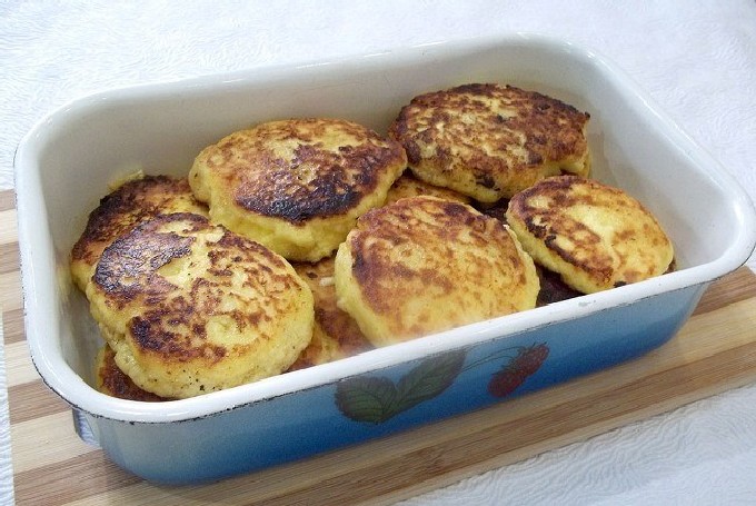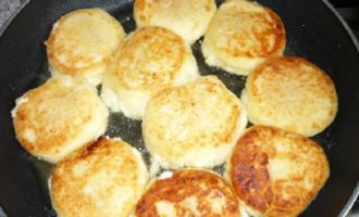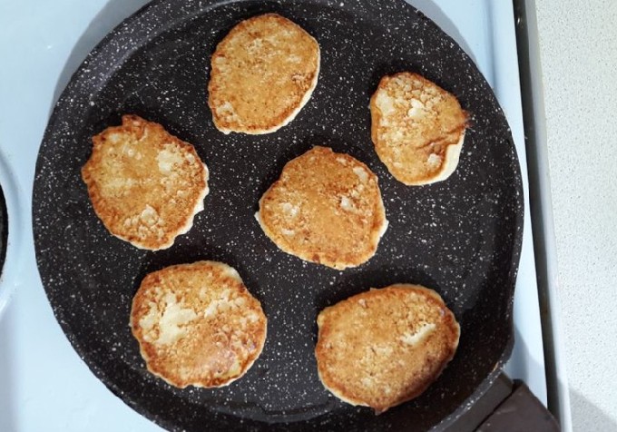 - Verhit plantaardige olie in een zware koekenpan. Leg de deegballen in hete boter, druk ze aan met een spatel om de cakes te vormen. Bak op laag vuur aan beide kanten tot er een mooie goudbruine korst ontstaat.