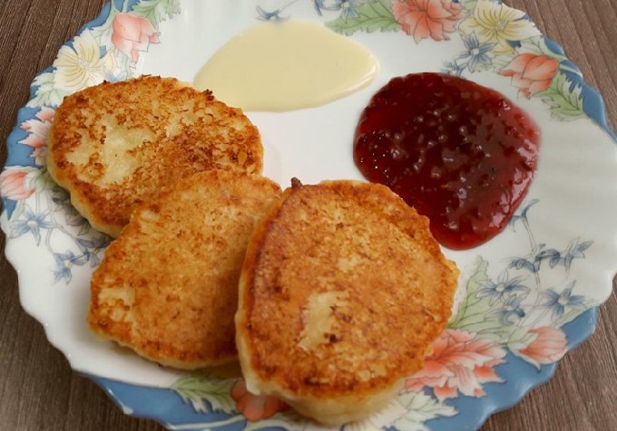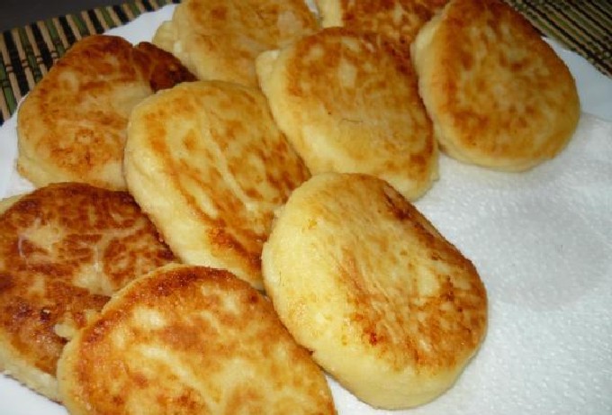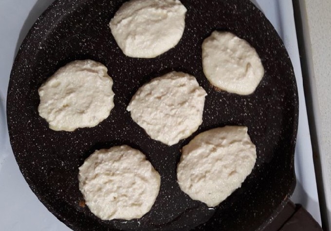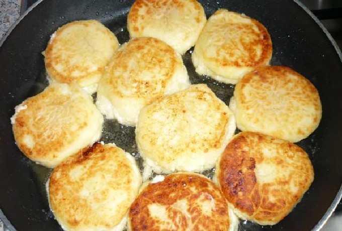 - Verhit een brede koekenpan met plantaardige olie op middelhoog vuur. Verzamel de wrongelmassa met een eetlepel en doe deze in de kokende olie in een glaasje.Er zullen dunne cakes worden gevormd.