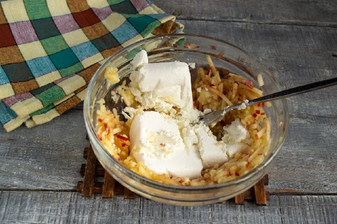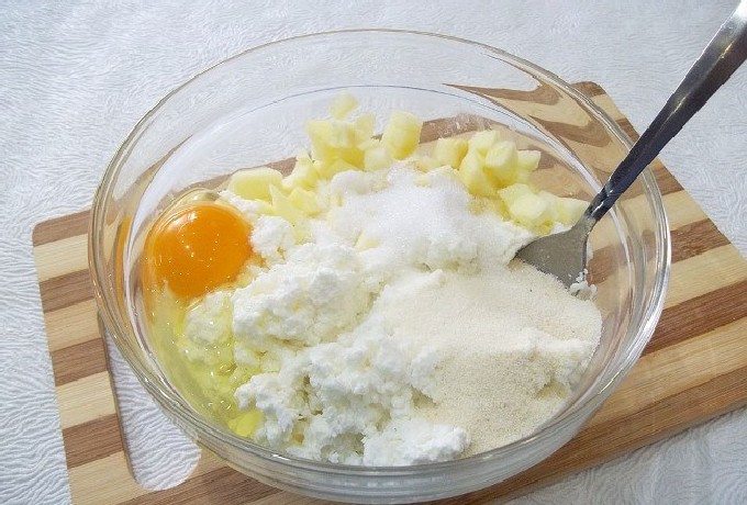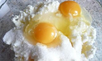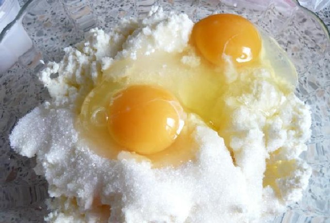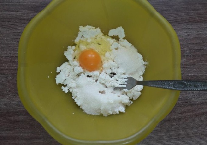 - Doe de geraspte kwark in een brede kom. Voeg kristalsuiker toe en roer. Klop het ei een beetje los met een garde of mixer, giet over de cottage cheese met suiker. Meng alles goed.