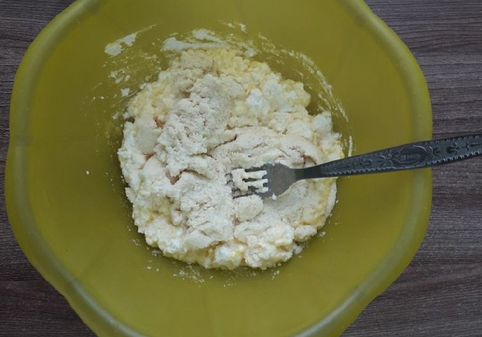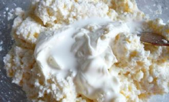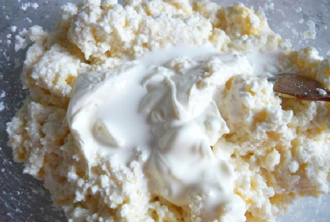 - Meng griesmeel vooraf met vette zure room en laat 15 minuten staan. zwellen. Pureer kwark met een vork, voeg een ei toe, voeg suiker toe (je kunt een beetje vanilline, vanillesuiker of een druppel vanille-essence toevoegen), voeg 1 snufje zout toe. Meng alles grondig.