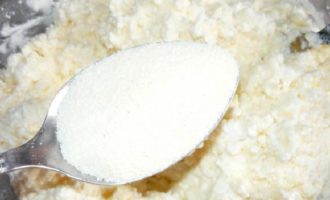 - Voeg het gezwollen griesmeel toe aan de wrongelmassa en kneed grondig.