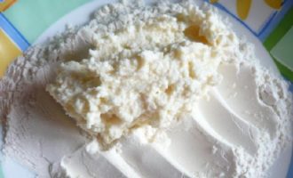 - Strek een zeef of vergiet uit met gaas dat in 4 lagen is gevouwen, leg de kwark daar, dek af met de randen van het gaas en leg een bord op de kwark, waarop een zware lading wordt geplaatst. Laat 2 uur in de koelkast staan.