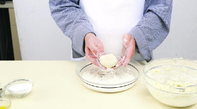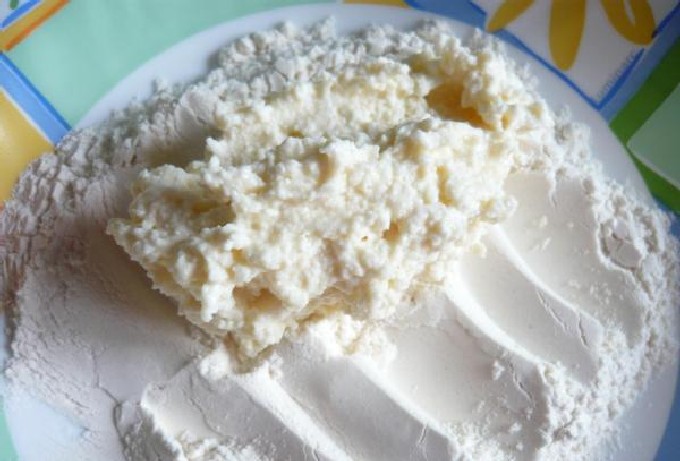 - Giet tarwebloem op tafel (ongeveer 3-4 eetlepels L.). Vorm kleine balletjes van de wrongelmassa, rol ze door bloem. Druk elke bal een beetje plat om dikke wrongelringen te krijgen.