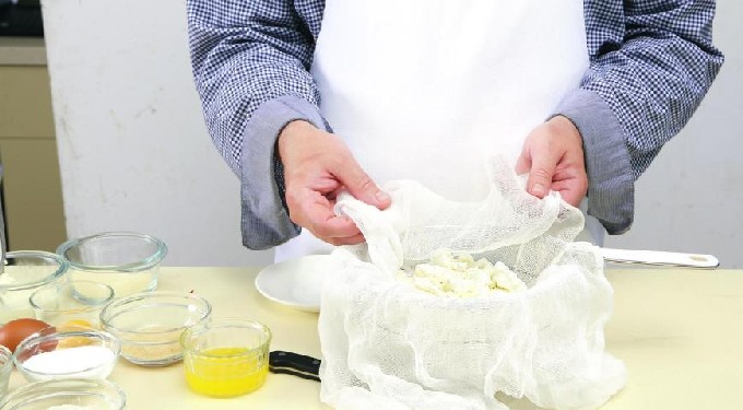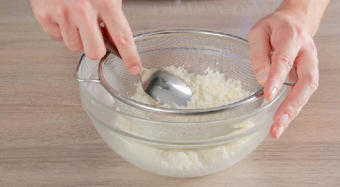 - Wrijf de wrongel door een fijne zeef. Als er te veel vocht in de wrongel zit, moet deze eerst in kaasdoek worden gelegd, in vieren gevouwen, in een knoop worden gelegd en 6 uur onder een pers worden gelegd. Hierdoor blijft er alleen droge wrongelmassa in het gaasje achter en stroomt alle wei eruit.