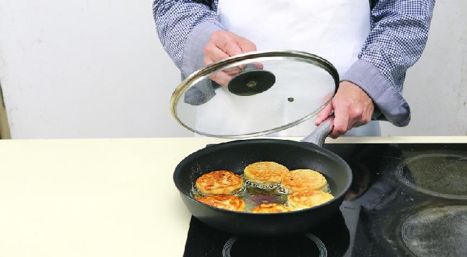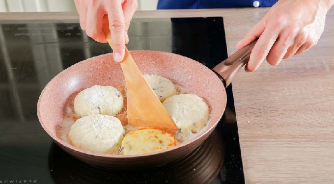 - Verhit olie in een grote koekenpan. Leg de cheesecakes in kokende olie en bak ze aan beide kanten goudbruin op middelhoog vuur. Je kunt de cheesecake pas omdraaien als de korst verschijnt, anders kan hij uit elkaar vallen. Bedek de pan met een deksel en laat de inhoud ongeveer 5 minuten zachtjes sudderen.