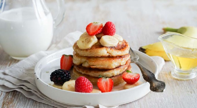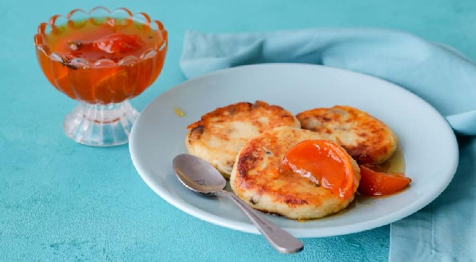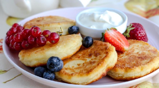 - Serveer kwarkpannenkoekjes met gecondenseerde melk, jam, zure room of verse bessen.