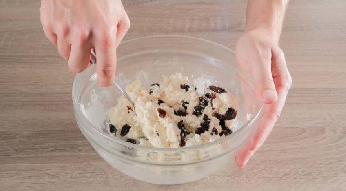 - Voeg de rozijnen toe aan het kaas-pannenkoekenmengsel. Roer nogmaals goed door. Laat het cheesecakedeeg op kamertemperatuur staan en laat het 10 minuten staan.
