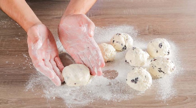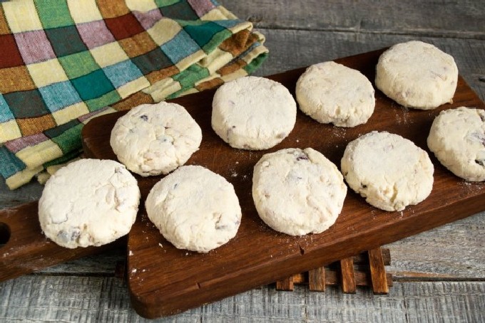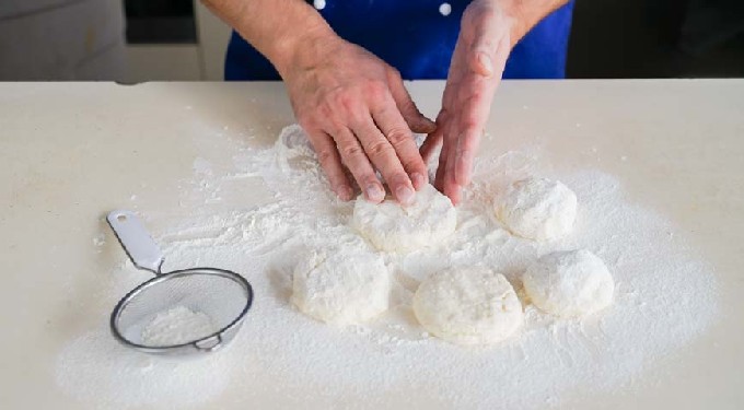 - Scheur stukken met een gewicht van ongeveer 40 g van het wrongeldeeg en vorm een bal van elk stuk en rol het door de bloem. Maak aan het einde elke bal plat tot een dikke ronde ring. Bestuif alle wrongelcakes opnieuw met bloem.