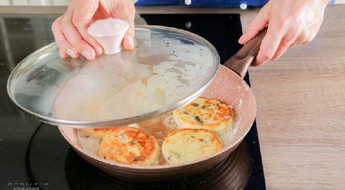 - Draai de cheesecakes om en bak ze goudbruin. Bedek de pan met een deksel, zet het vuur lager. Zet de cheesecakes 5 minuten onder het deksel.