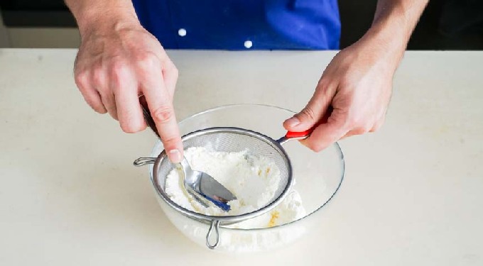 - Wrijf de kwark door een fijne zeef, dit is vooral belangrijk voor drogere dichte kwark met granen. Als de kwark een hoge luchtvochtigheid heeft, moet deze van tevoren in een gaasknoop worden geplaatst, vastgebonden en gedurende 5-6 uur onder een pers worden geplaatst. Gedurende deze tijd zal de overtollige vloeistof uit de wrongel verdwijnen.