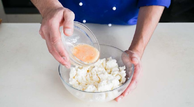 - Drijf eieren in een kom tot de wrongelmassa, voeg griesmeel, bloem toe en meng alles met een garde tot een gladde massa.