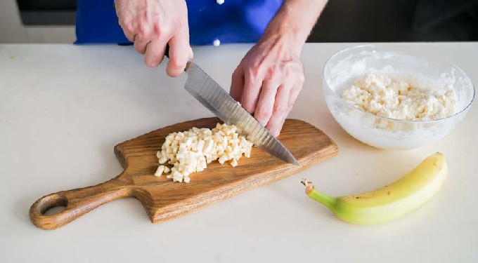- Zeef griesmeel met bakpoeder in de wrongelmassa en meng tot gecombineerd. Bananen moeten het meest rijp en zacht worden gekocht, geel met bruine stippen. Schil de vrucht, snij in zeer kleine stukjes en voeg toe aan de massa. Mix alles opnieuw. Als het deeg wat dun is, voeg dan nog wat griesmeel toe.