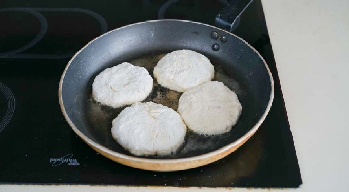 - Neem een brede koekenpan met een grote diameter en verwarm hierin de ontgeurde plantaardige olie. Leg licht afgeplatte cirkels wrongeldeeg in boter en bak ze aan één kant goudbruin.