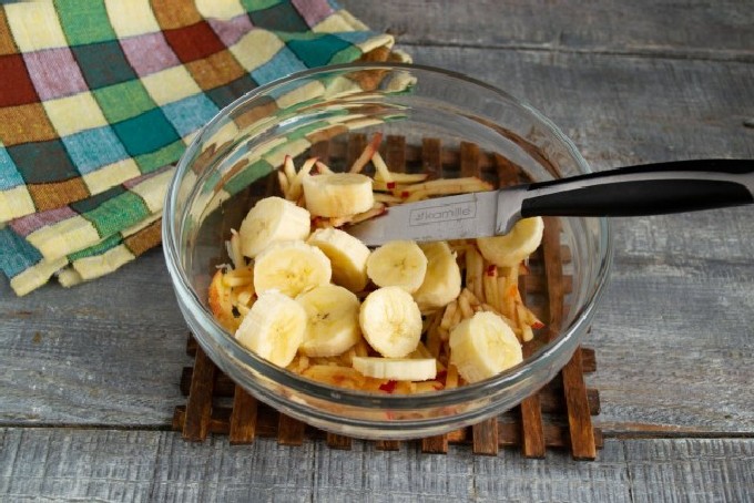 - Voeg een halve zeer rijpe banaan toe aan de appelschaal. Banaan kan zelfs met een licht zwartgeblakerde schil worden gegeten, deze vruchten zijn het zoetst.