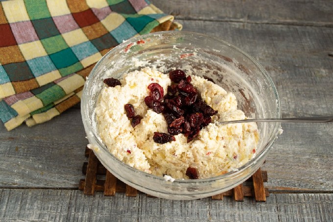 - Giet over de gedroogde veenbessen met kokend water, laat 5 minuten in een zeef staan en droog ze op keukenpapier. Voeg de veenbessen toe aan het kaaspannenkoekdeeg, meng goed.