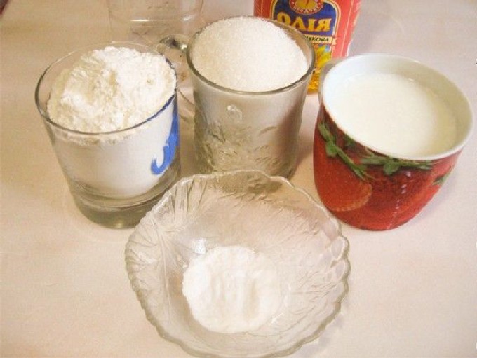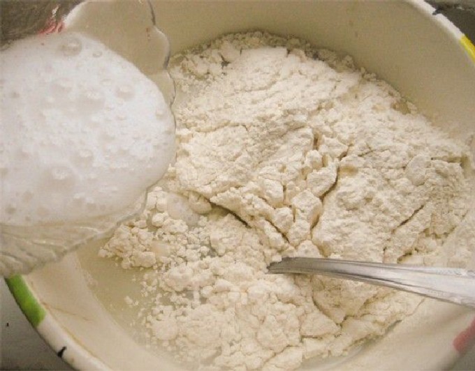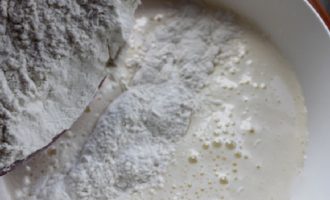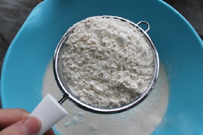 - Zeef de bloem door een zeef, dit kan je direct in een bak met melk doen. Meng voorzichtig, voeg soda geblust met azijn toe. Als de klontjes moeilijk te breken zijn, kun je een mixer gebruiken en het deeg glad kloppen.