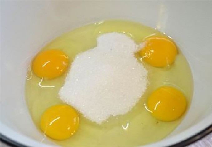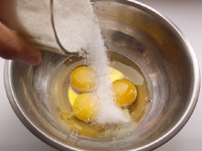 - Breek de eieren in een aparte kom, voeg suiker toe, klop met een mixer of klop tot de massa wit wordt en in volume toeneemt.