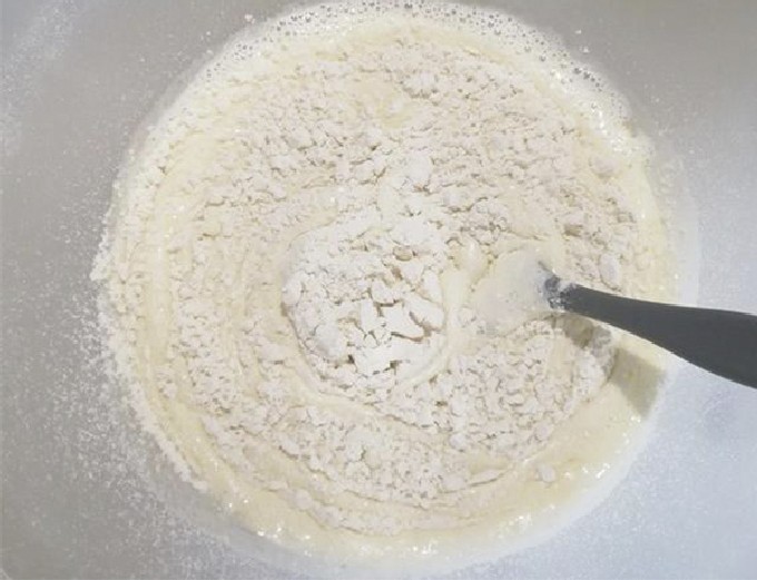 - Voeg gezeefde bloem en bakpoeder toe aan het deeg, meng goed.