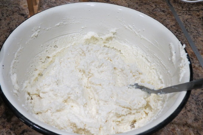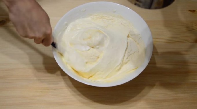 - Het is beter om fijnkorrelige kwark te nemen. Meng het met de resterende suiker en eieren. Dan combineren we beide massa's, goed mengen.