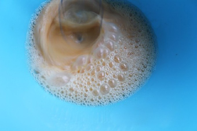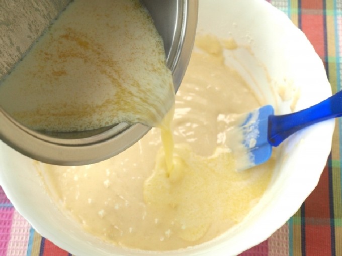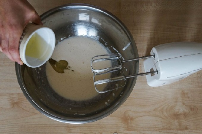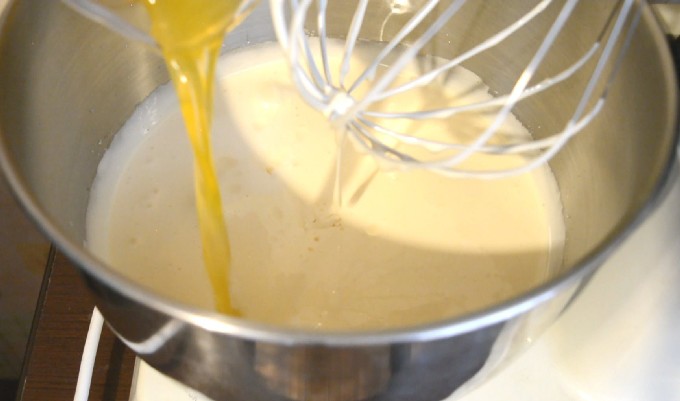 - Giet melk en plantaardige olie in de eiermassa, meng.