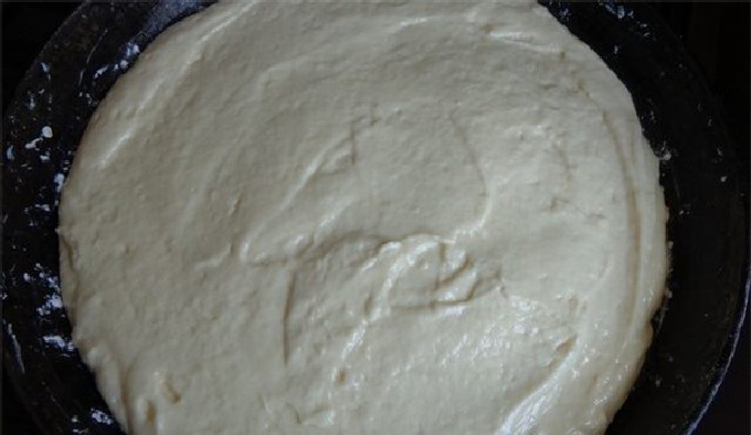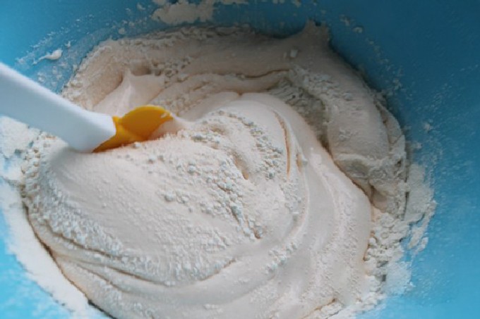 - Voeg bloem in kleine porties toe aan het deeg en blijf kloppen op een lagere snelheid. De consistentie van het deeg moet lijken op dikke zure room.